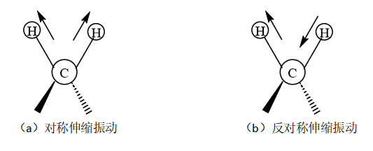 特点:伸缩振动又分为对称伸缩振动和反对称伸缩振动,键长发生周期性变化而键角不变。